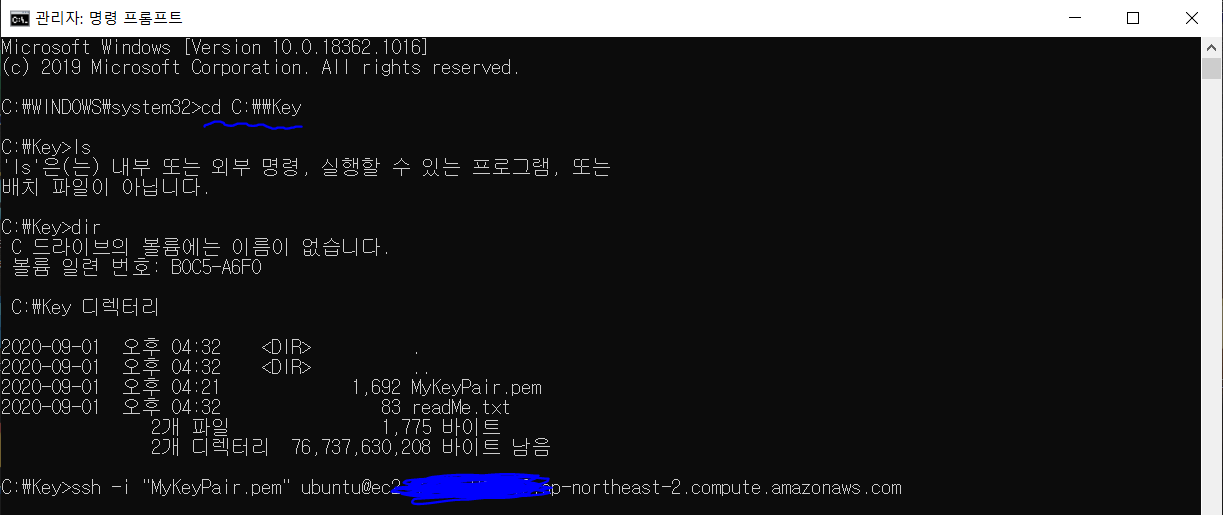 10. 관리자 권한의 cmd 또는 터미널로 해당 키 위치로 이동한다. ssh 명령어를 수행한다.