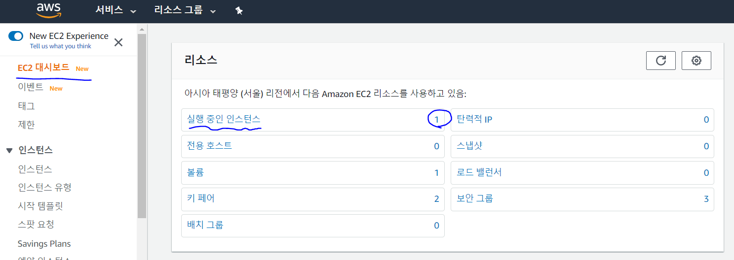 8. 인스턴스가 생성되고 나면, 다시 EC2 대시보드 - 실행중인 인스턴스 를 누른다.