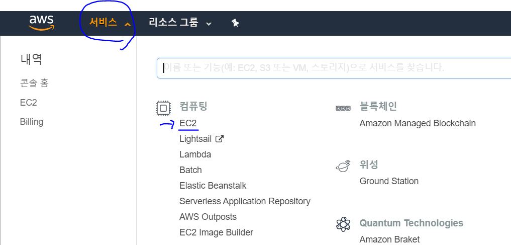 1. 콘솔에 로그인 한 후 서비스 - EC2로 들어간다.