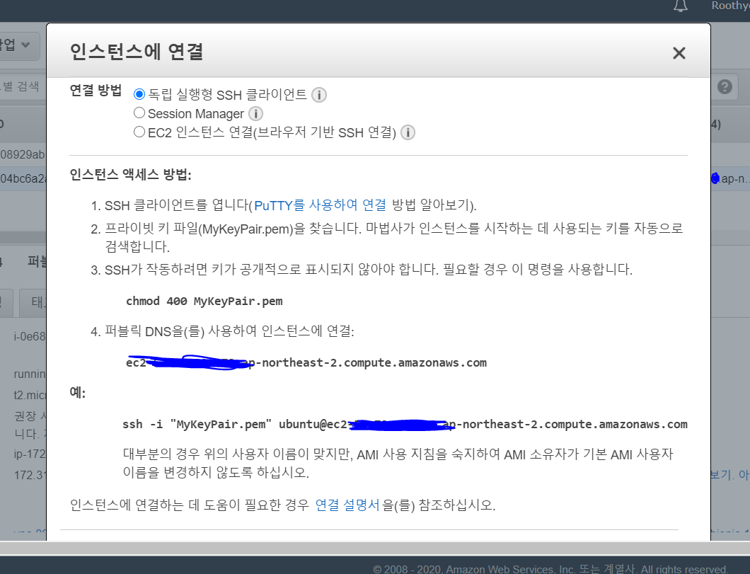 다음과 같은 Modal이 뜨게 되는데, 요약하자면 다운받은 Key파일을 권한 설정을 400, 관리자만 가능하게 만들고, Key가 있는 위치에서 관리자 권한의 cmd로 ssh 명령어를 치면 서버에 연결이된다.