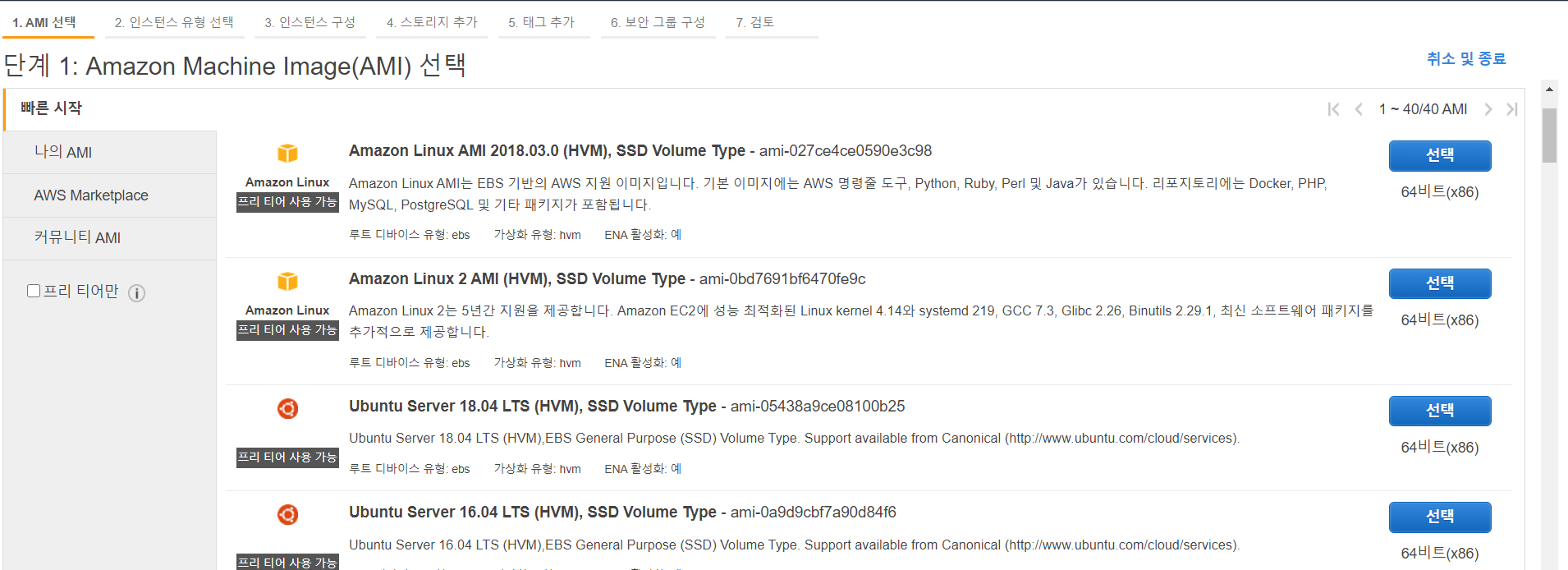 4. Ubuntu 18.04 LTS를 선택한다. (사실 Linux AMI 를 택해도 무방한것 같다.)