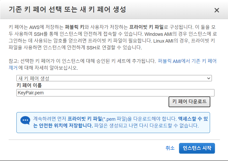 7. 기존의 키를 받았다면, 기존키를 쓰고, 기존 키가 없다면 키 이름[ex)'KeyPair']을 입력한 후 '키 페어 다운로드'를 통해 키 파일을 받고, '인스턴스 시작'를 누른다.