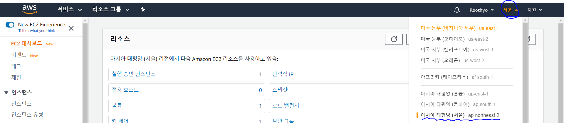 2. 프로필 옆에 지역에서 아시아 태평양 (서울) 을 선택한다.