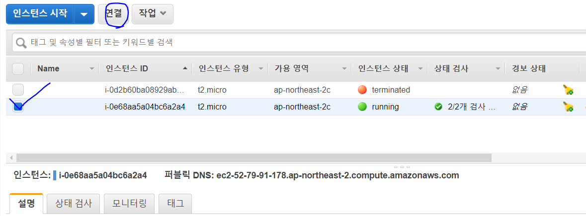 9. 자신이 만든 인스턴스를 체크하고 연결을 클릭한다.