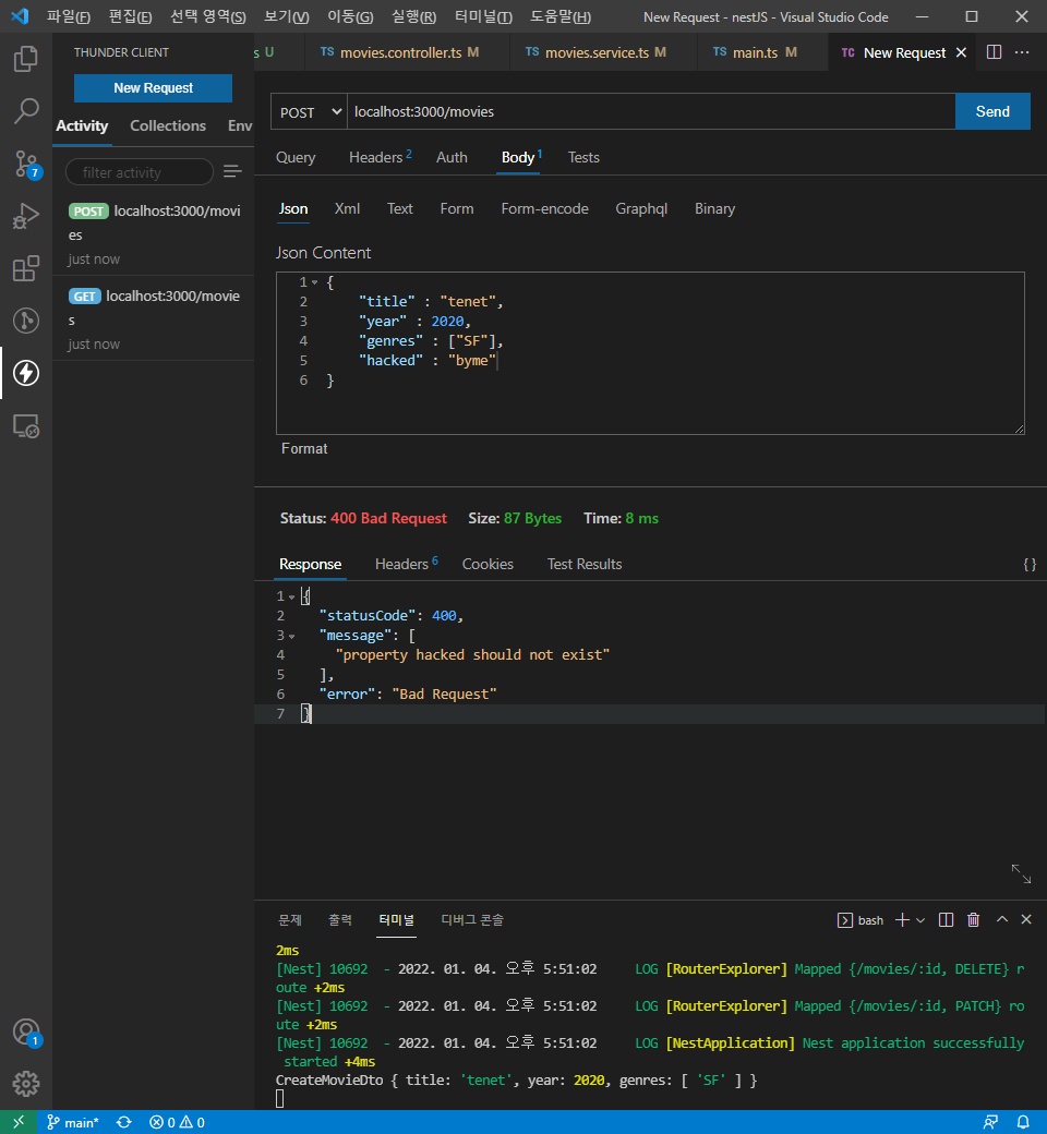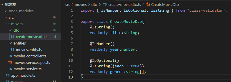movies 디렉토리 하위에 dto 디렉토리를 생성하고 create-movie.dto.ts 파일을 생성하고 DTO 객체를 생성하여, export 하고, class-validator를 통해 각 데이터를 검증해준다.