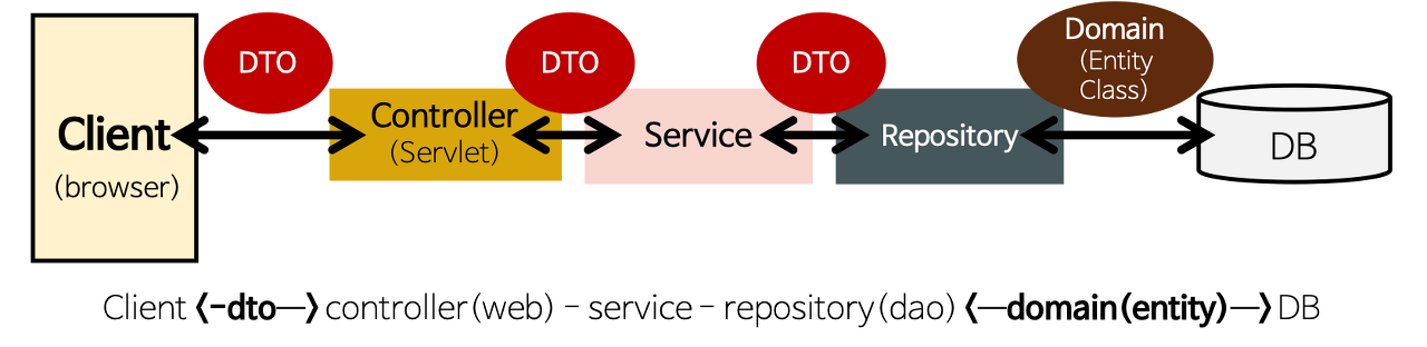 추가적으로 VO(Value Object)가 있는데, VO도 DTO와 동일한 개념이나, DTO는 데이터를 계층간 교환하는데 의미가 있고, VO는 읽기만 가능한 read-only 속성을 가진 객체로서 데이터 그 자체에 의미를 두고 있다는 점이다.