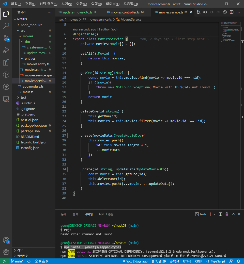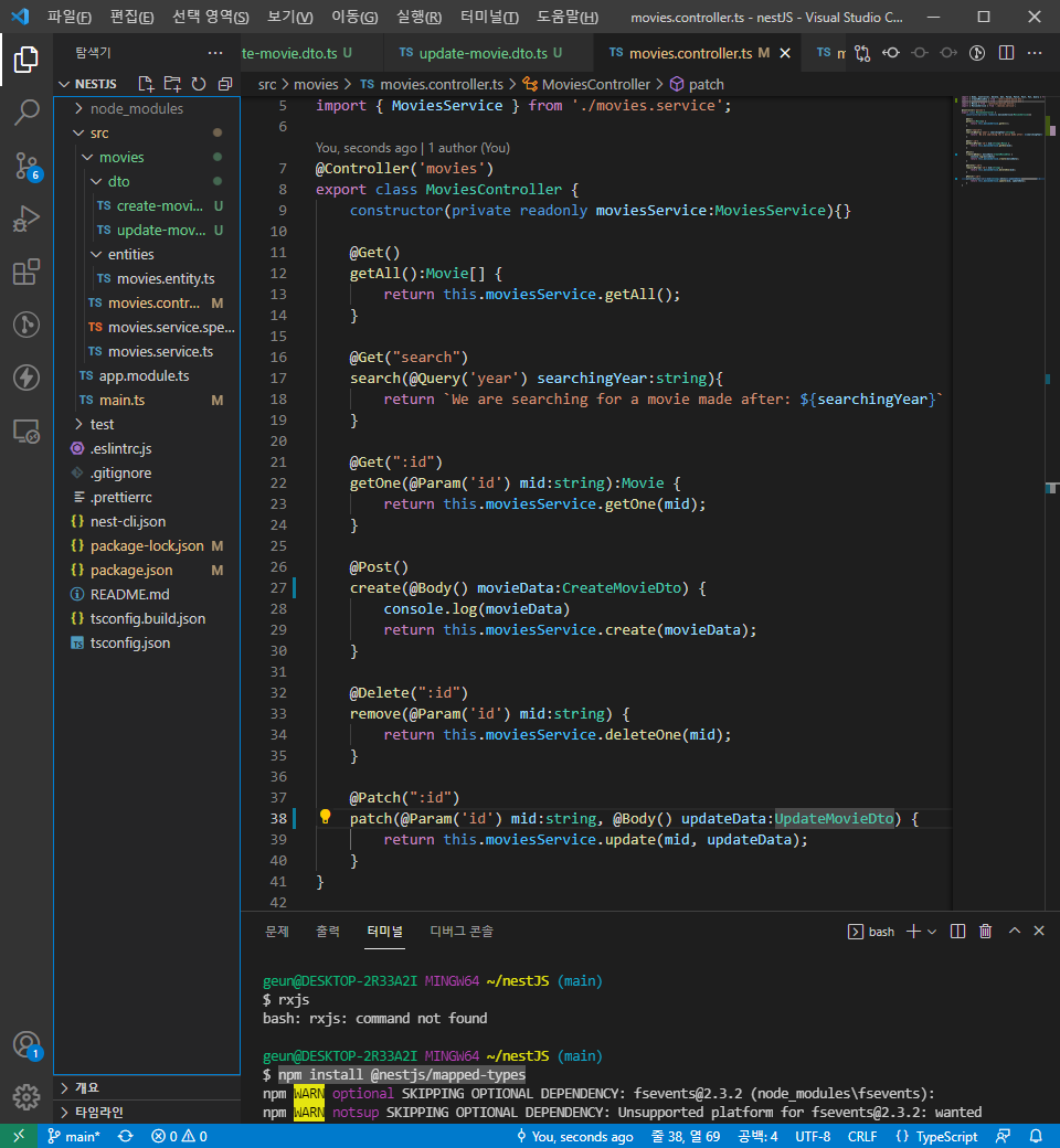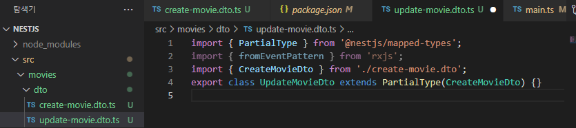 먼저, @nestjs/mapped-types 라이브러리를 설치하고 update-movie.dto.ts 파일을 생성하여 다음과 같이 입력하자.