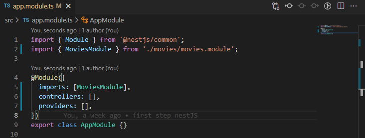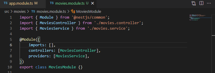 이 후 app.module.ts에 movie에 대한 controller와 service는 제거하고 모듈만 연결시키는 방식으로 프레임워크를 관리하면 된다.