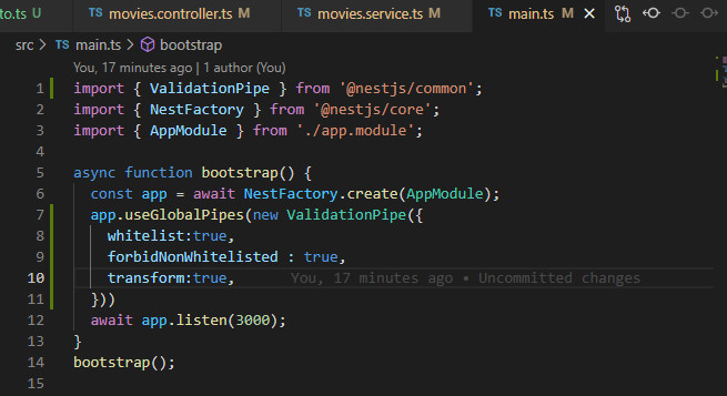 main.ts에 다음과 같은 옵션을 입력해 validation 기능을 준다. Express의 middleware라고 보면 될 듯 하다.