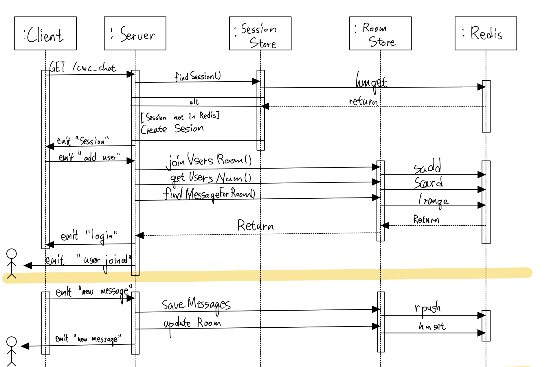 노란색 선을 기준으로 위는 Login과정, 아래는 message가 이동하는 과정을 묘사한 것입니다.