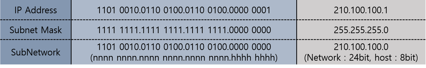 Ex) 210.100.100.1 이 IP주소이고, 서브넷 마스크가 255.255.255.0이라면,