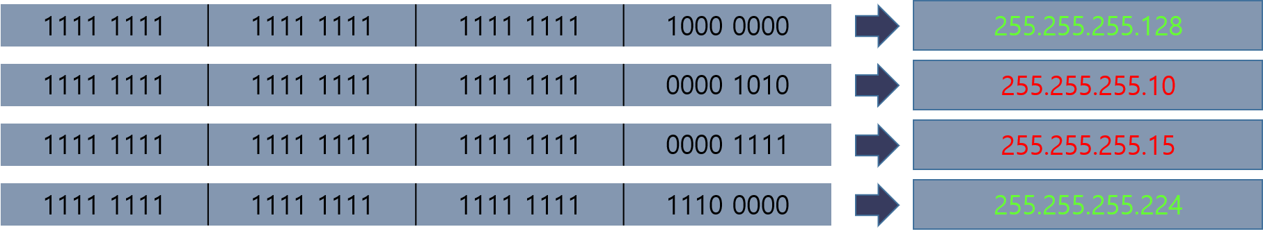 ▶ 이진수로 썼을 때, 서브넷 마스크에 1이 연속적으로 나와야 한다.