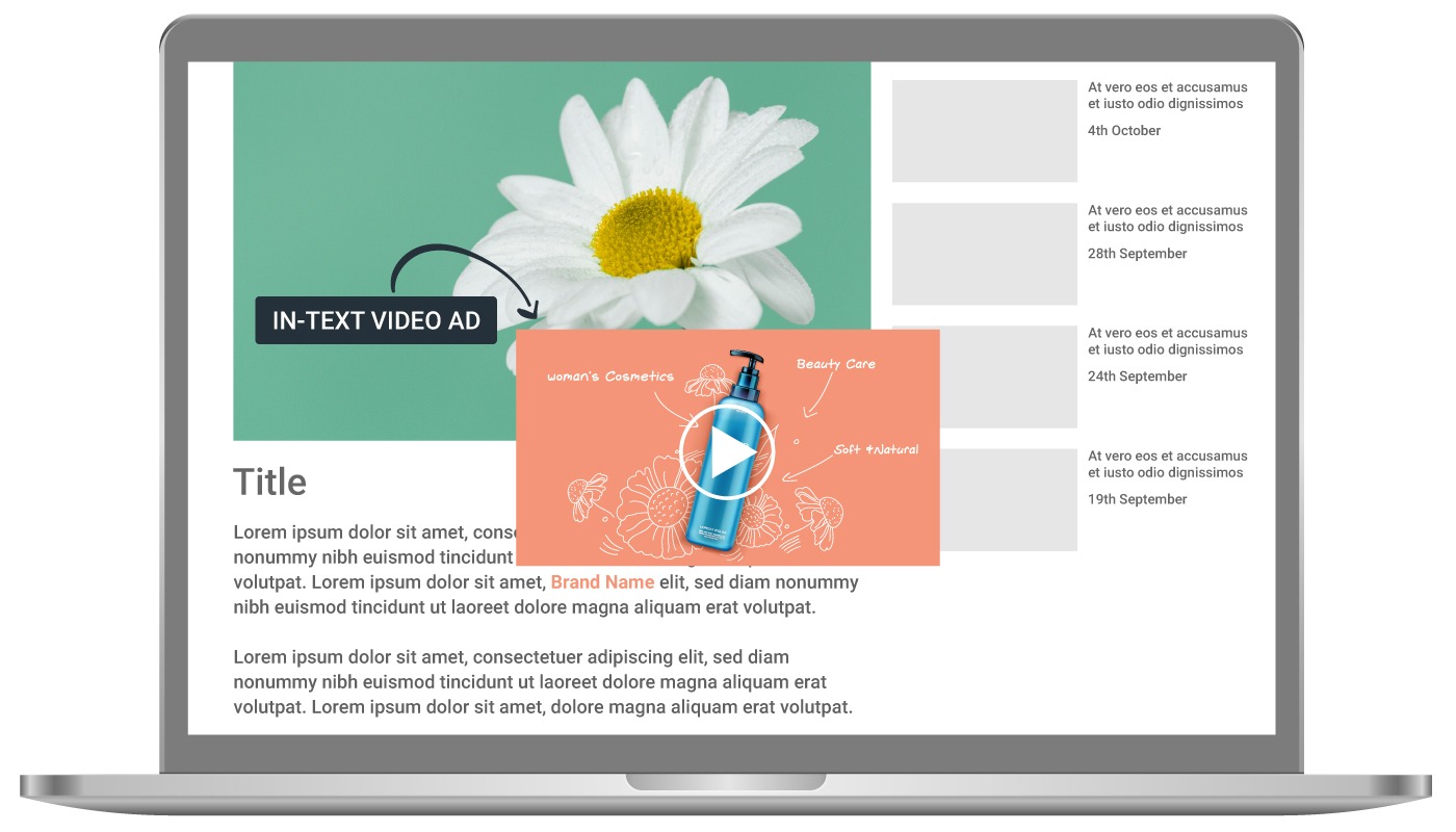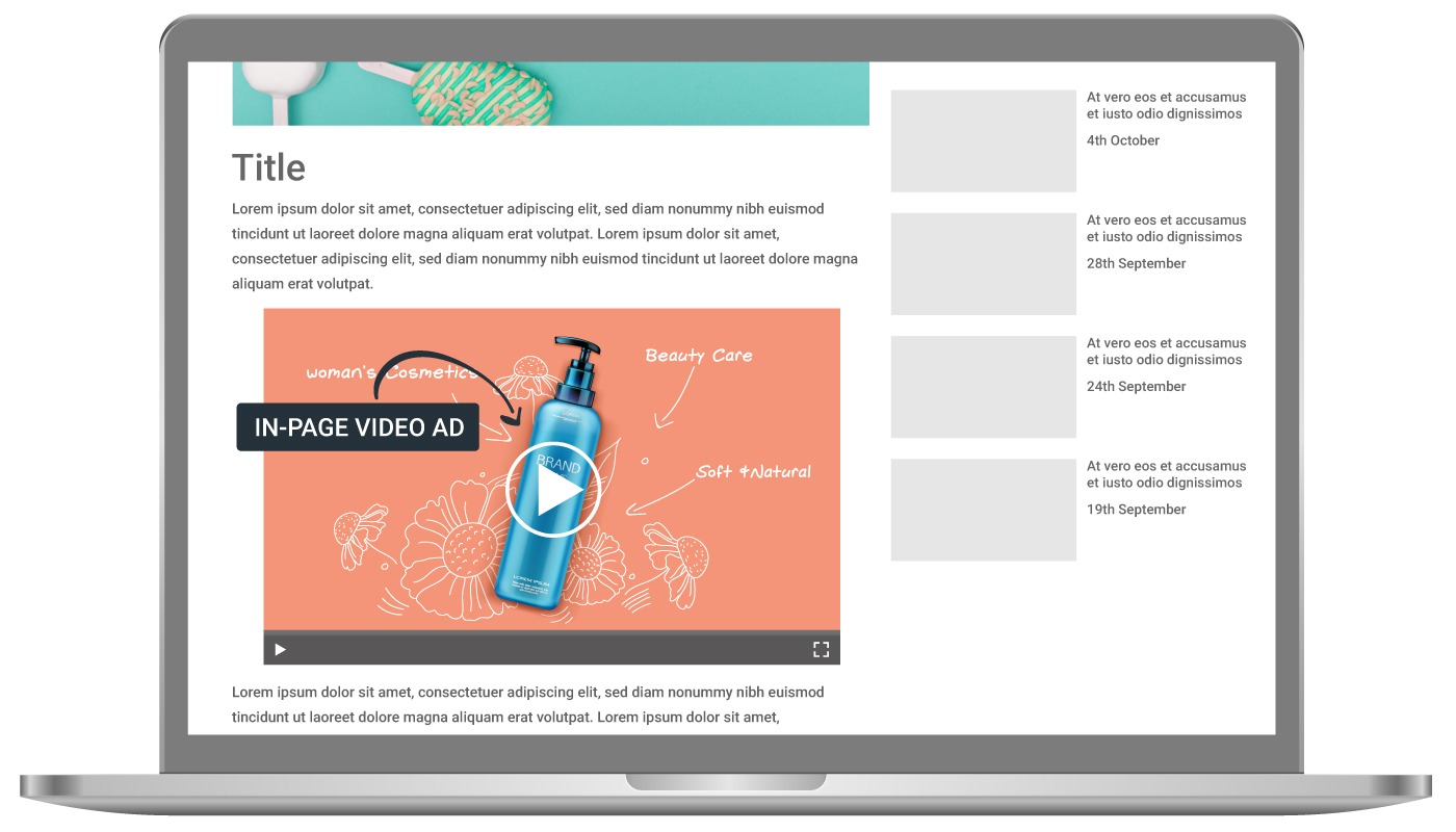 : 웹 페이지의 텍스트 내용 내의 비디오 광고가 스크롤 되는 것에 트리거 되는 광고 방식. 50% 이상 화면에 보이면 비디오가 시작하고, 50% 이하로 화면에서 나가면 비디오가 정지된다.