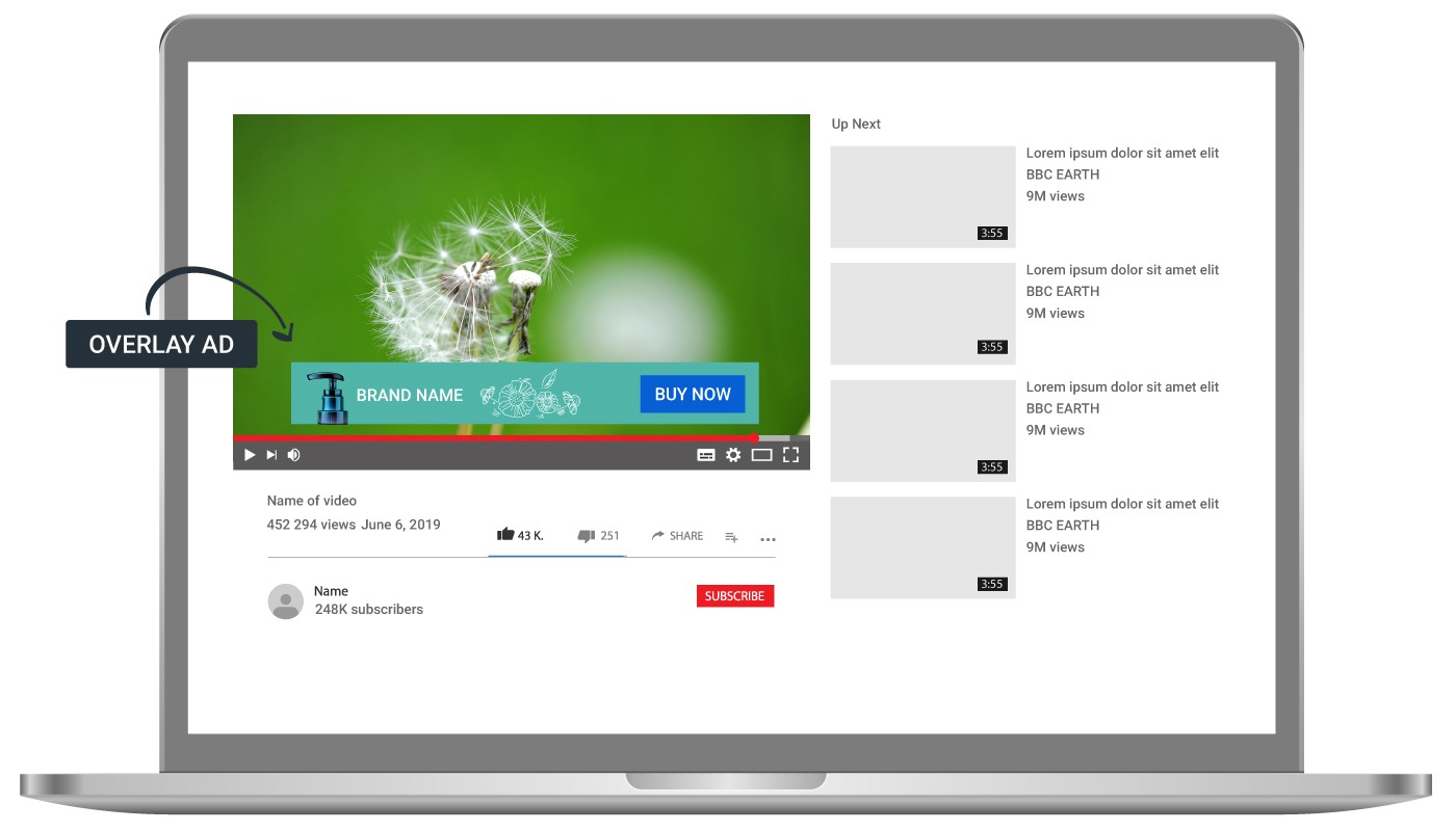 - Overlay : 비디오 콘텐츠 위에 하위 20%정도만 가리며, 재생되는 동안 여러 브랜드 제품 광고를 사용할 수 있는 장점이나, 비디오 자막 등 비디오의 다른 정보를 가릴 가능성이 있다는 것이 단점이다.