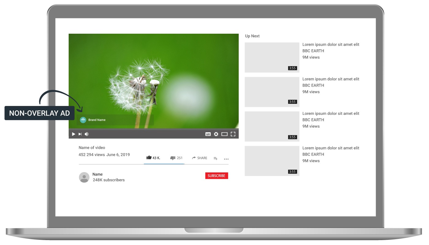 - Non-overlay : 비디오 콘텐츠와 동시에 반투명한 화면을 띄우는 등 덜 가린채로 광고하는 방식.