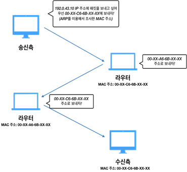 MAC주소를 ARP를 이용하여 구하고 프레임을 보낸다. 라우터는 해당 프레임을 받아서 목적하는 주소로 프레임을 전달해준다.